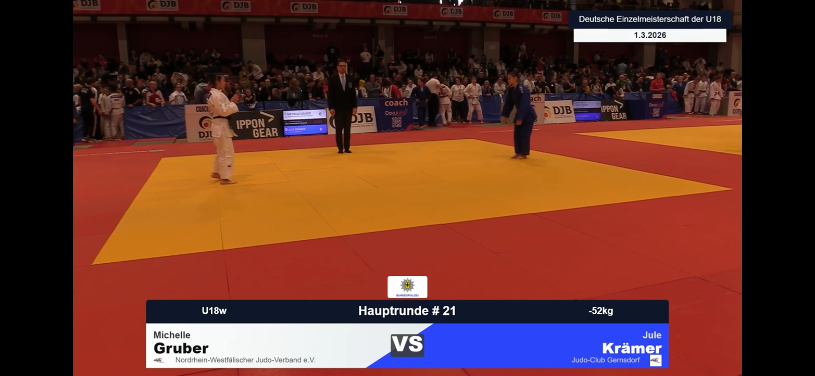 Unsere Jule Krämer kämpft in 2026 erstmalig in der U18. Über einen ersten Platz bei den Bezirksmeisterschaften und einem 5. Platz bei den Westdeutschen hatte sie sich nun qualifiziert zu den Deutschen Meisterschaften in Leipzig. In der ersten Runde hatte es Jule mit Anny Schmidt aus Frankfurt/Oder zu tun. Jule war hellwach und schoß ihr Gegnerin nach wenigen Sekunden mit einer Kontertechnik ab. In der nächsten Runde wartete dann die Bundeskader Athletin Michelle Gruber aus Düsseldorf. Hier hatte Jule keine Chance. In der Trostrunde traf Jule nun auf Emila Blank aus Neubrandenburg. Jule ging zunächst mit zwei Yuko Wertungen in Führung. Blank holte dann auch einen Yuko. Dieser wurde nach Video Beweis hochgestuft auf einen Waza-Ari. Nun in Rückstand versuchte Jule das Blatt zu wenden aber wurde letztlich wegen Divings disqualifiziert. Sehr ärgerlich denn Jule war hier mindestens auf Augenhöhe. Trotzdem kann Jule sehr zufrieden die Heimfahrt ins Siegerland antreten. Einen Kampf auf der Ebene zu gewinnen und im ersten Jahr U18 bei einer Deutschen Meisterschaft mithalten zu können ist eine super Leistung. HerzlichenGlückwunsch dazu.